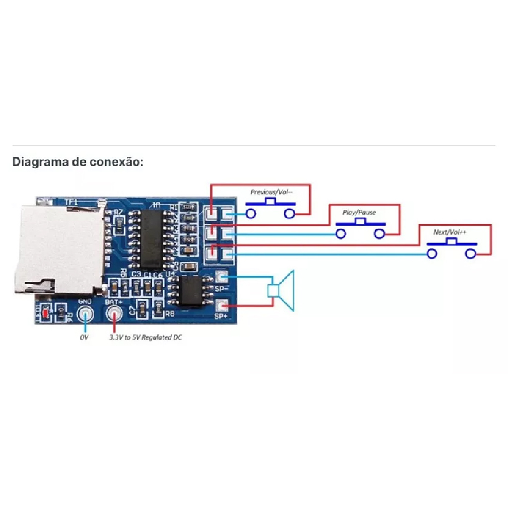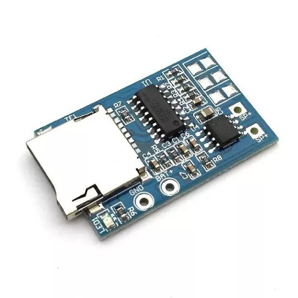 Este módulo de decodificador de placa MP3 para cartão TF utiliza o IC decodificador de MP3 GPD2856A e possui um amplificador de áudio mono misto L/R integrado de 2 watts IC (8002). É a versão atualizada da placa decodificadora MP3 de cartão TF GPD2846A anterior, que agora possui um slot para cartão TF para um cartão de memória micro-SD e um indicador de energia LED. Com dimensões de 35 mm × 22 mm, este módulo é fácil de usar, requer apenas uma fonte de alimentação, conexão direta de alto-falante e interruptores. O fabricante recomenda uma tensão de trabalho entre 3,7 a 5 V