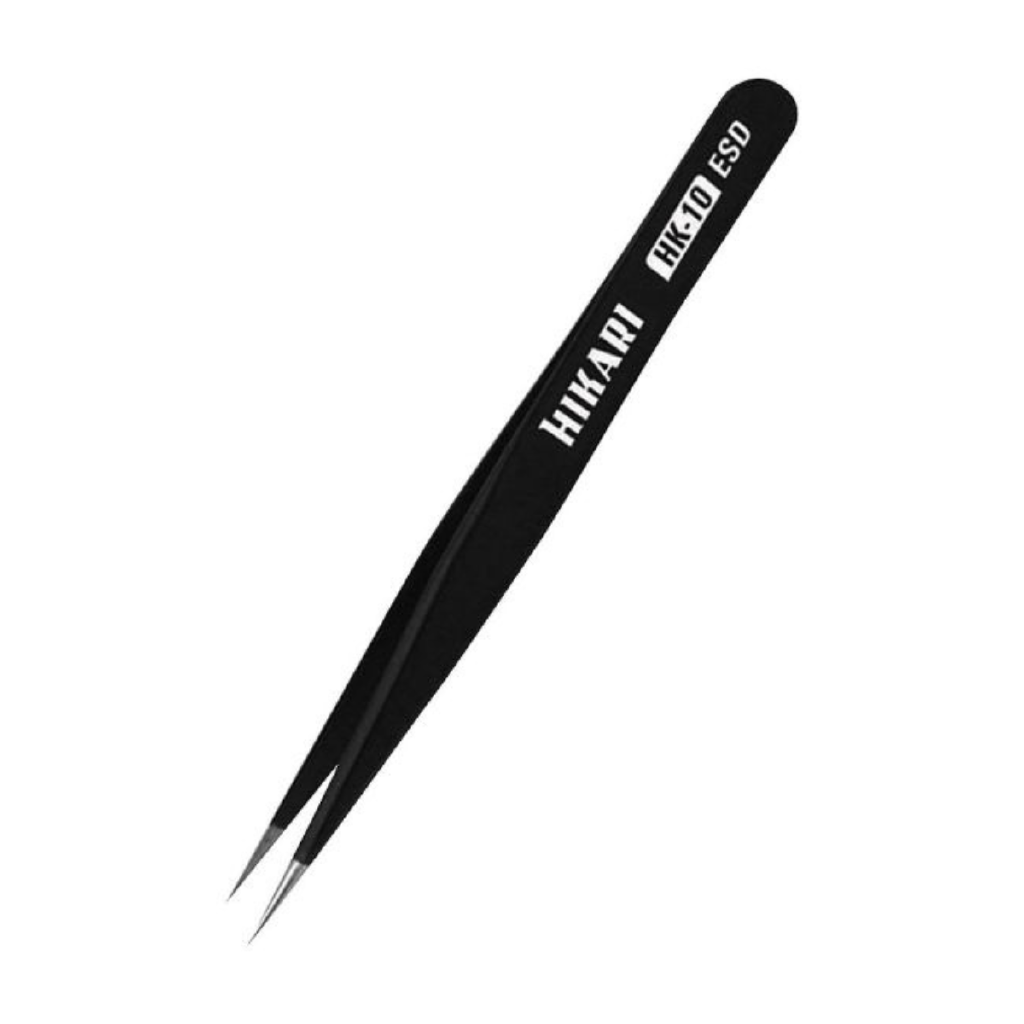 Pinça em aço inoxidável modelo HK-10 ESD reta com ponta afiada. Anti-magnética, anti-estática, anti-ácida e não corrosiva. Boa durabilidade e praticidade. As pontas são finas e longas com a superficie lisa e arredondada.